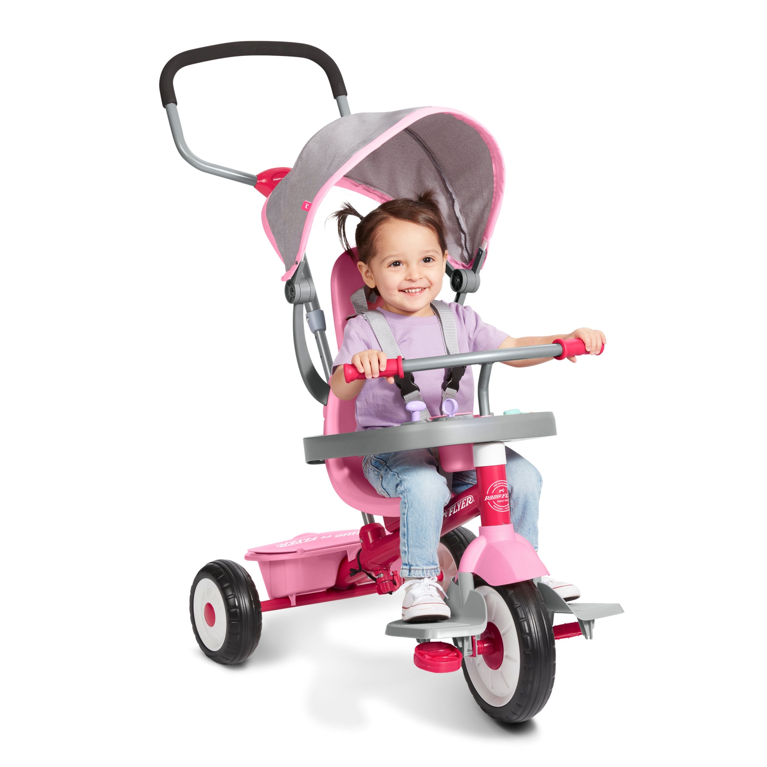 ?4 Ways to Roll. Ride. & Play: This grow-with-me trike goes from push-along strolls to pedal-powered play. Easily shift through four stages by removing accessories??no tools (or tantrums) required.