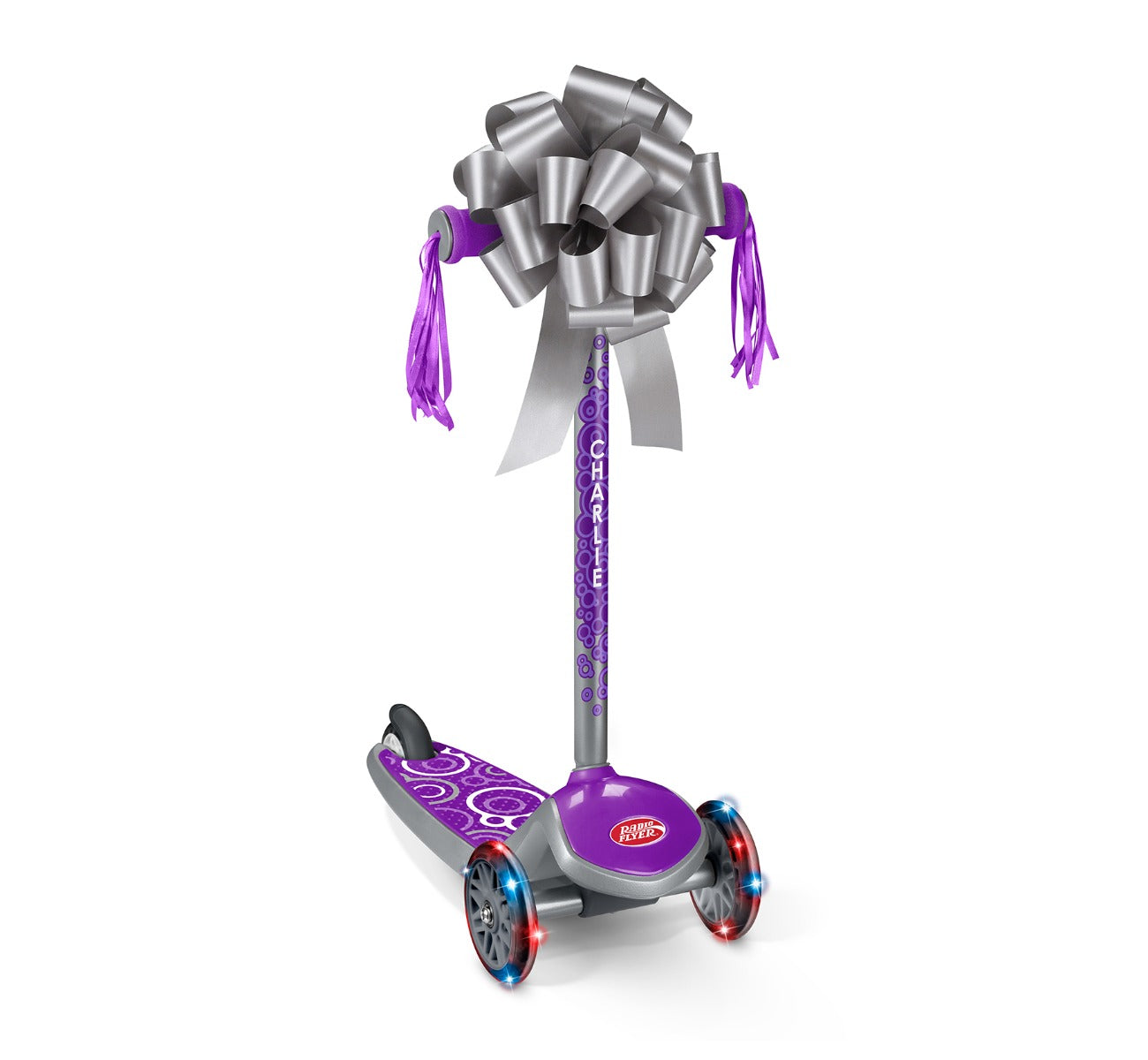 Wrap your Radio Flyer gift with an elegant silver bow! This bow makes gifting easy: it arrives flat and conveniently assembles in seconds. Perfect for ride-ons. scooters. balance bikes. and trikes.