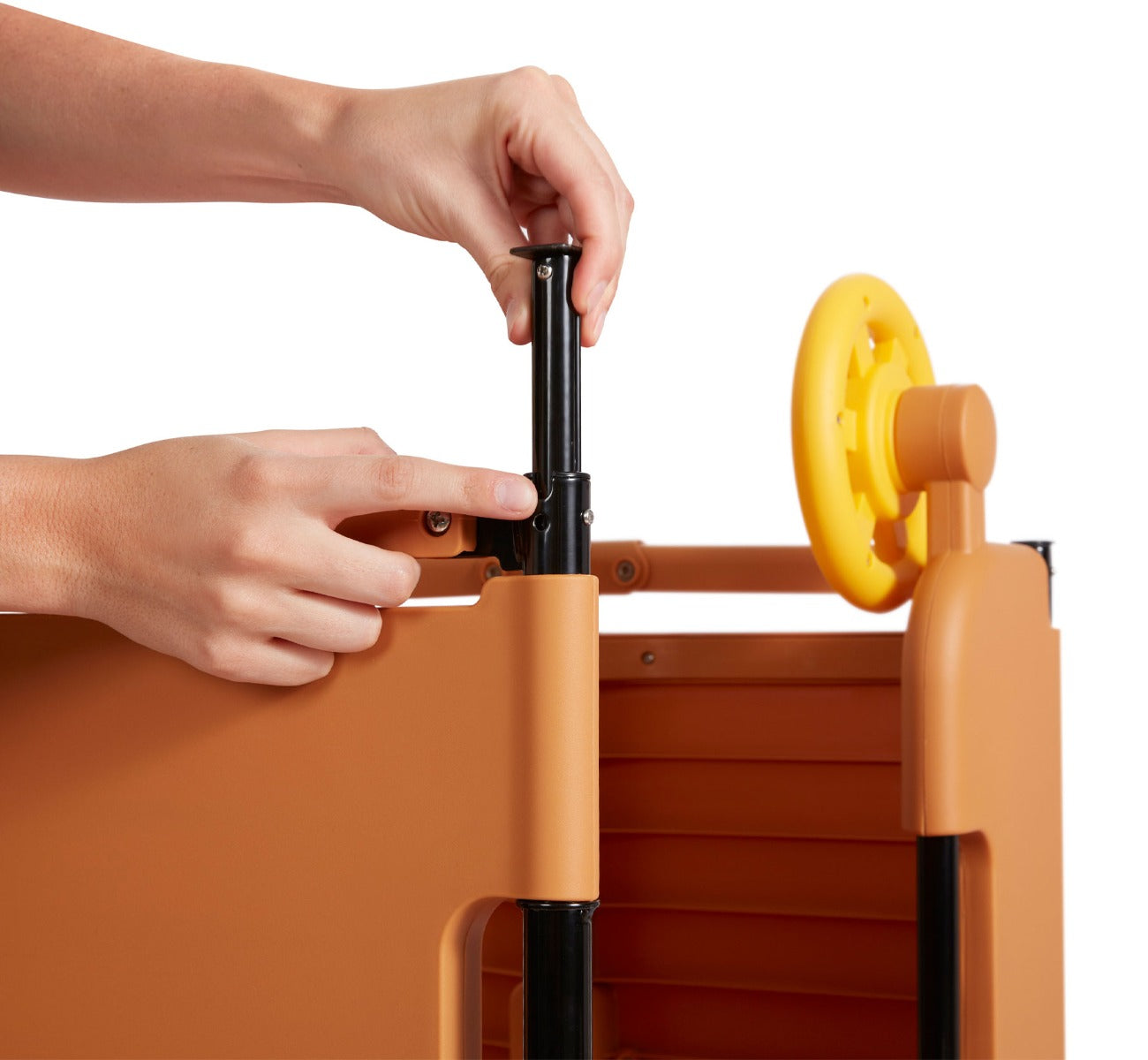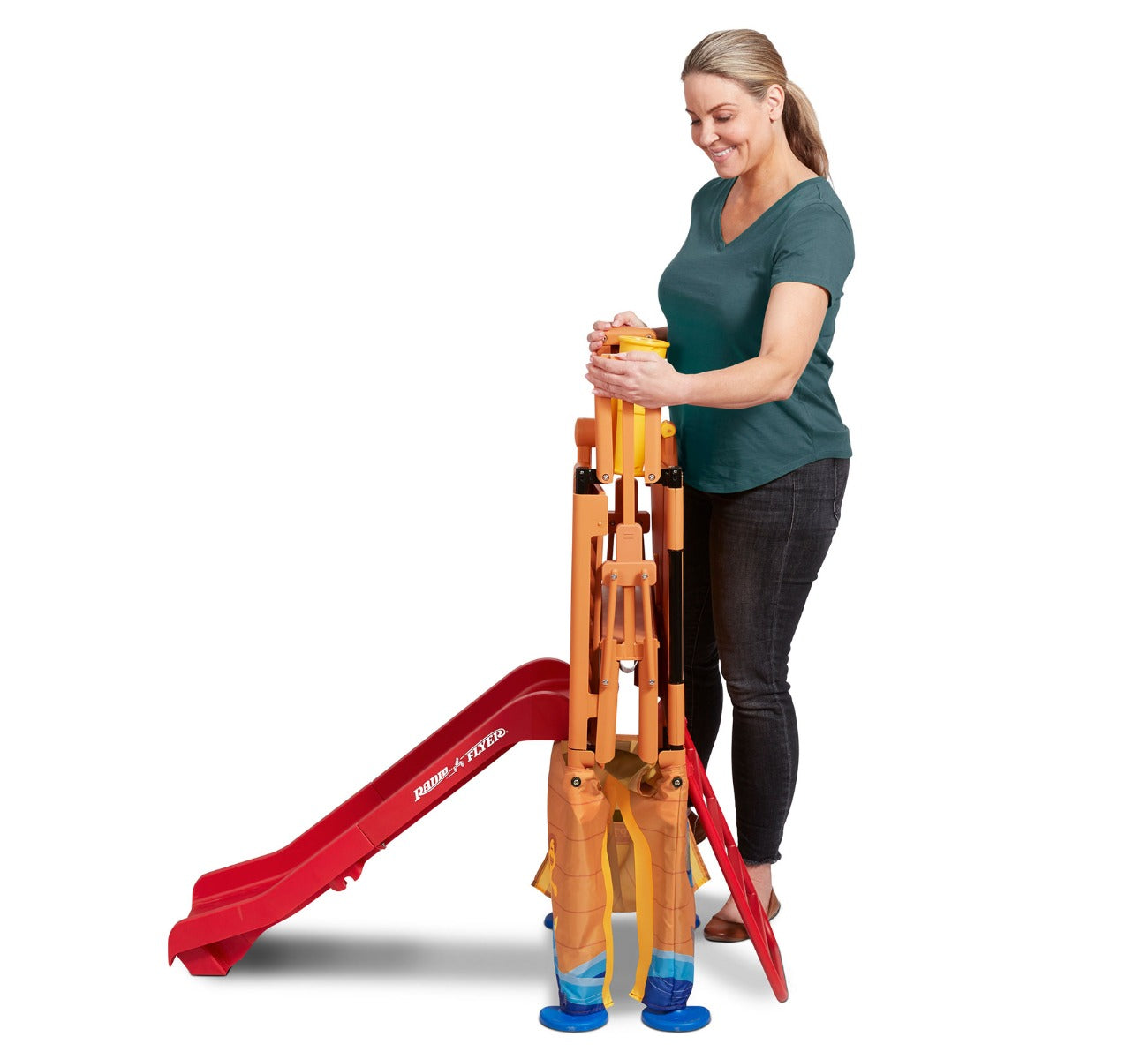 Radio Flyer’s Play & Fold Away Pirate Ship is a fun new playhouse that encourages active imaginative play! The unique folding mechanism allows this to be easily stored when not in use and the carrying handle makes this the most convenient climber for your family! Kids can create their own adventures on the sturdy platform with a telescope and steering wheel. The telescope swivels and pivots while the steering wheel rotates freely. The climbing ladder allows easy entry. and the built-in slide adds to the fun! Beneath the stable platform is a secret play space that features two doors and mesh windows. The fabric canopy is removable. and the canopy poles retract into the frame when not in use. Recommended for ages 2 ?C 5 years.