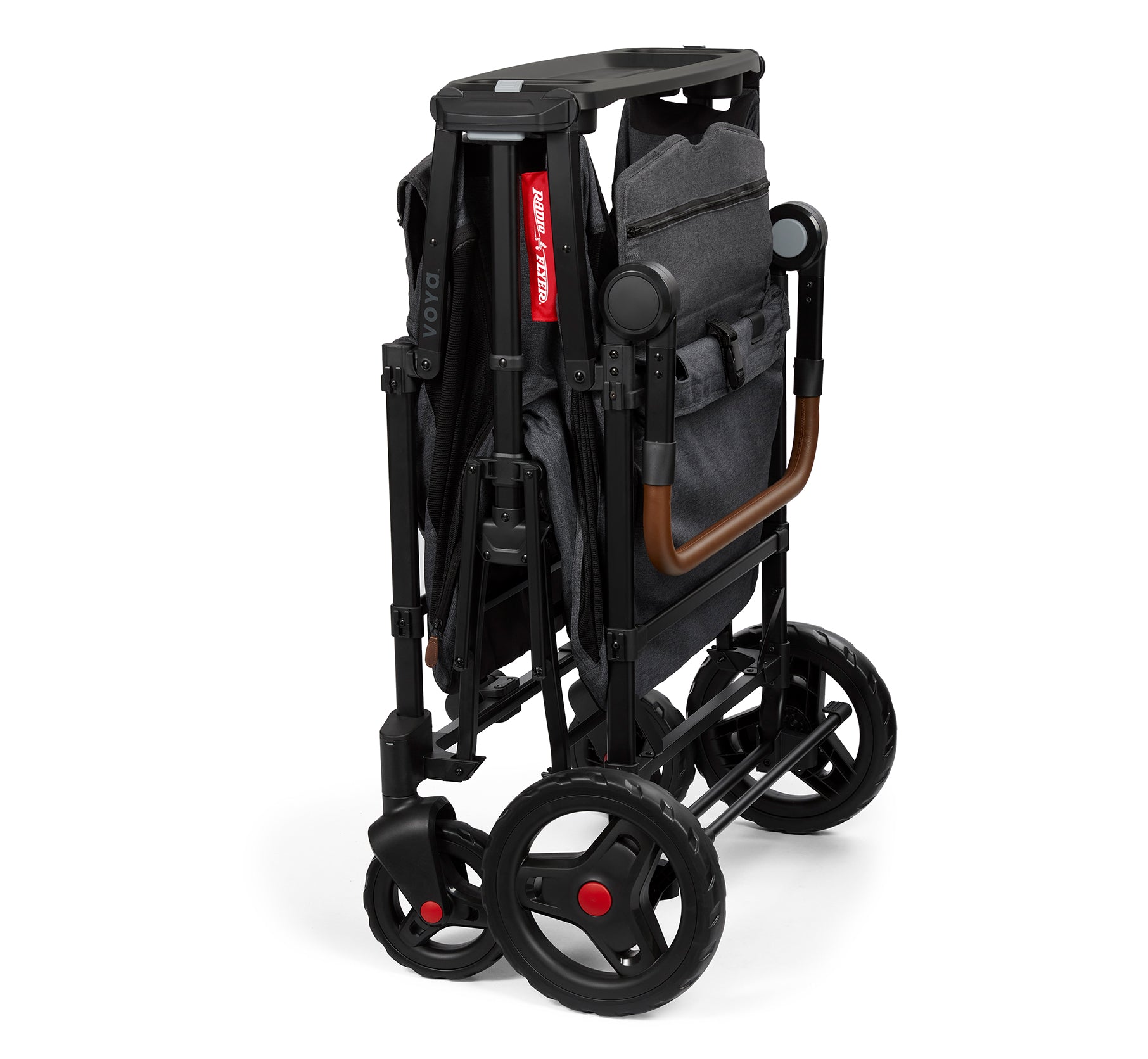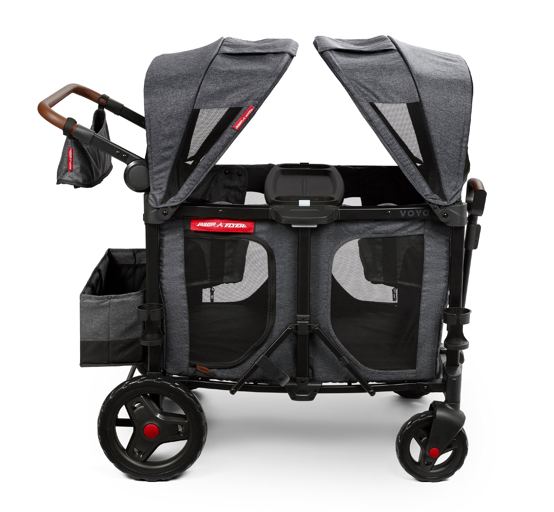 The Voya? XT Quad Stroller Wagon is the ultimate kid-carrying and cargo-hauling stroller wagon. Comfortably carry up to 4 kids and everything else you or your kids may need with the high sidewalls and spacious interior. The zippered entry side doors make entering and exiting the wagon a breeze for little ones. while the nimble steering make this the easiest 4-kid wagon to maneuver. The suspended removable seats and padded floor offer comfort and flexibility. The dual removable canopies with mesh peek-a-boo windows provide UPF protection. Additional included accessories are side-mounted cupholders. folding rear storage bag. and a removable snack tray with built-in cupholders. The accessories and seats do not need to be removed to fold the wagon. simply fold. and stow! The steel reinforced aluminum frame and rear parking brake ensure a smooth ride. The push handle is height adjustable with a wrist strap for added safety. and the Never Fall? Pull handle stays upright when not in use. Both handles feature our premium vegan leather handgrips. Embark on unforgettable family adventures with the Voya? XT Quad Stroller Wagon. Maximum weight capacity 300lbs. Recommended for 6+ months.